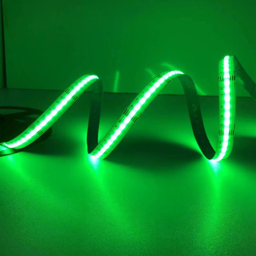 Las tiras COB adoptan la tecnología Chip-On-Board, chips LED de 840 piezas montados en la placa PCB de doble capa de 12 mm de ancho, flexibles y flexibles, la alta densidad de los chips LED elimina los puntos de luz visibles y las áreas oscuras, creando una tira de luz continua y gratuita. de puntos o pausas, perfecto para la aplicación de iluminación lineal continua en interiores.