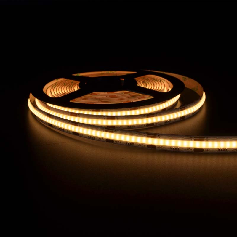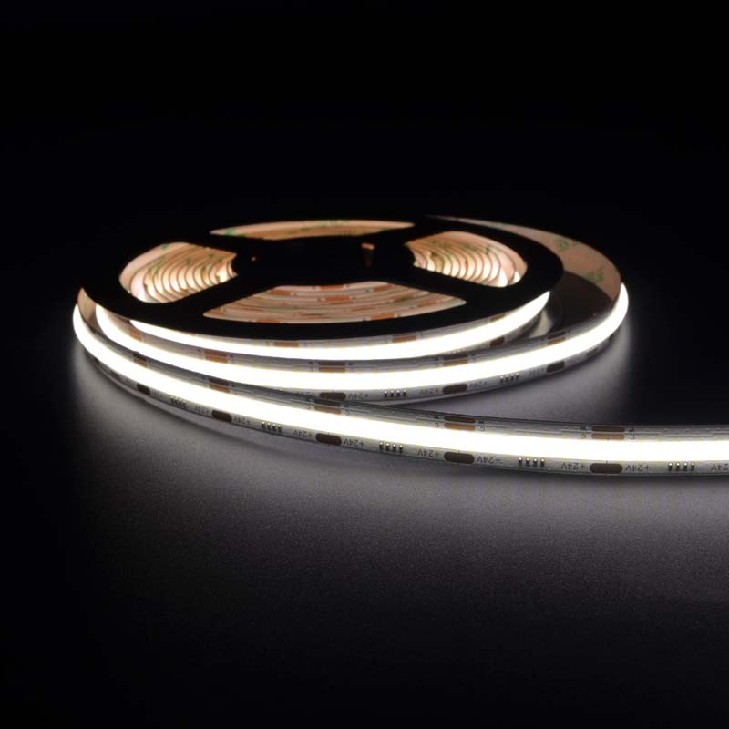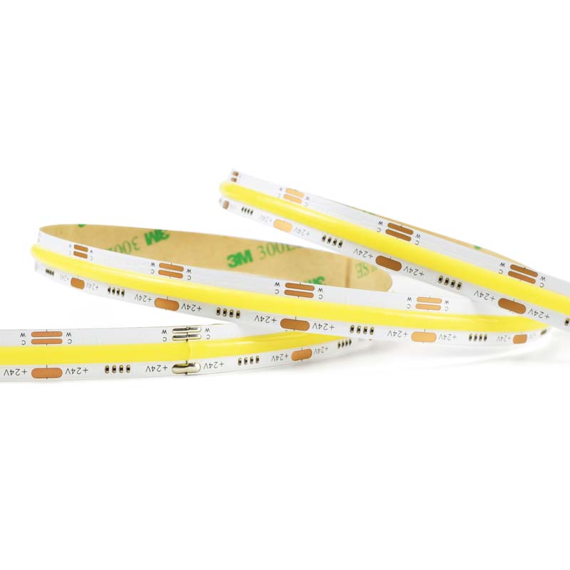 Las tiras flexibles COB blancas sintonizables contienen 608 LED por metro en una PCB flexible de 10 mm de ancho. Las tiras son capaces de emitir 1080-1248 lúmenes/m de luz continua y suave que emite a 180 grados. El amplio ángulo de visión y el flujo continuo de luz hacen de esta una importante mejora con respecto a las tiras de luces flexibles a las que está acostumbrado.